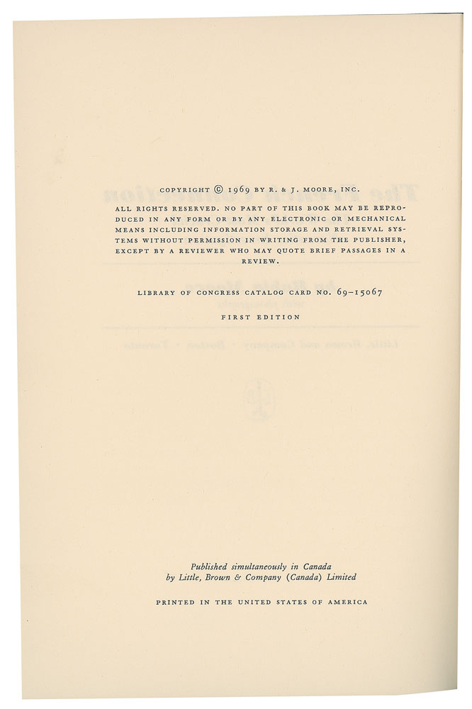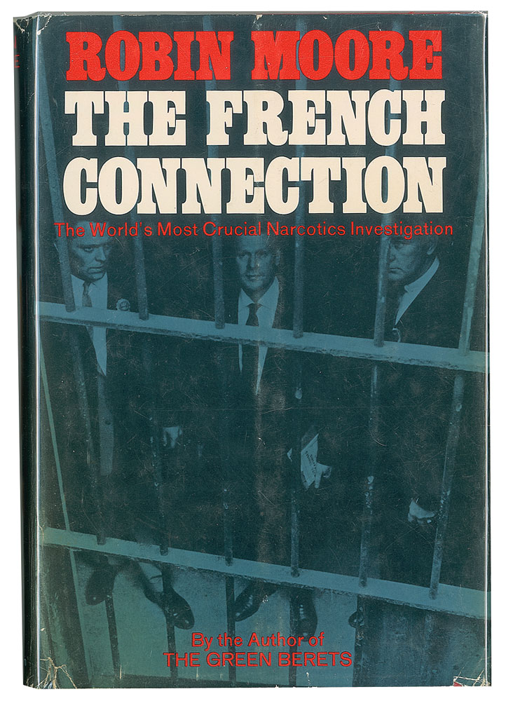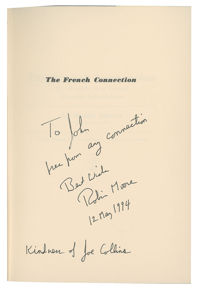 Signed book: The French Connection. First edition. Boston: Little, Brown and Company, 1969. Hardcover with dust jacket, 5.75 x 8.5, 309 pages. Signed and inscribed on the half-title page in black felt tip, "To John, free from any connection, Best wishes, Robin Moore, 12 May 1994, Kindness of Joe Collins." Autographic condition: fine. Book condition: VG/VG, with edgewear to the price-clipped dust jacket.