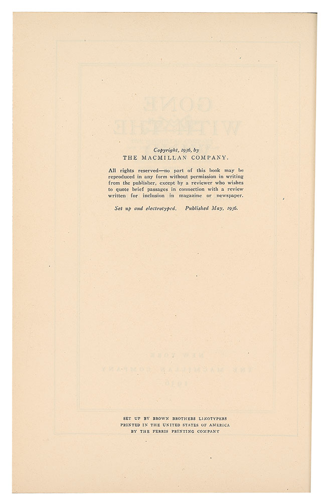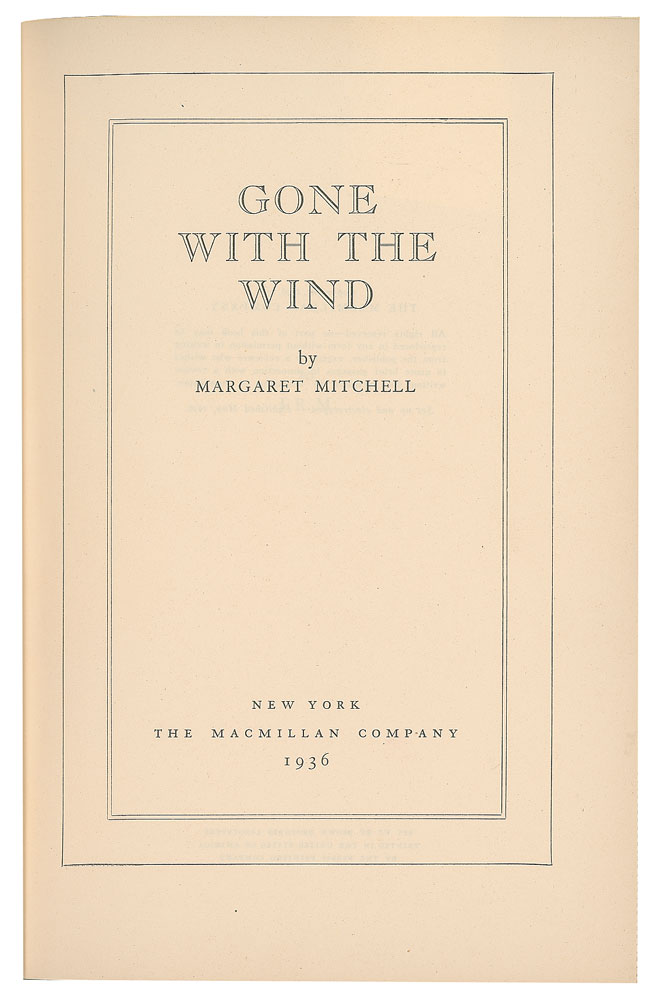 Sought-after unsigned first edition book: Gone With the Wind. First edition, first printing (with "Published May, 1936" on the copyright page, and "1936" on the title page). NY: The Macmillan Company, 1936. Hardcover with first-issue dust jacket (with "Gone With the Wind" in the rightmost column), 6.25 x 8.75, 1037 pages. Book condition: VG/VG-, with a price-clipped front flap of the dust jacket, a closed tear at the top of the the rear dust jacket flap, and tiny chips and edgewear. A handsome example of this highly desirable work.