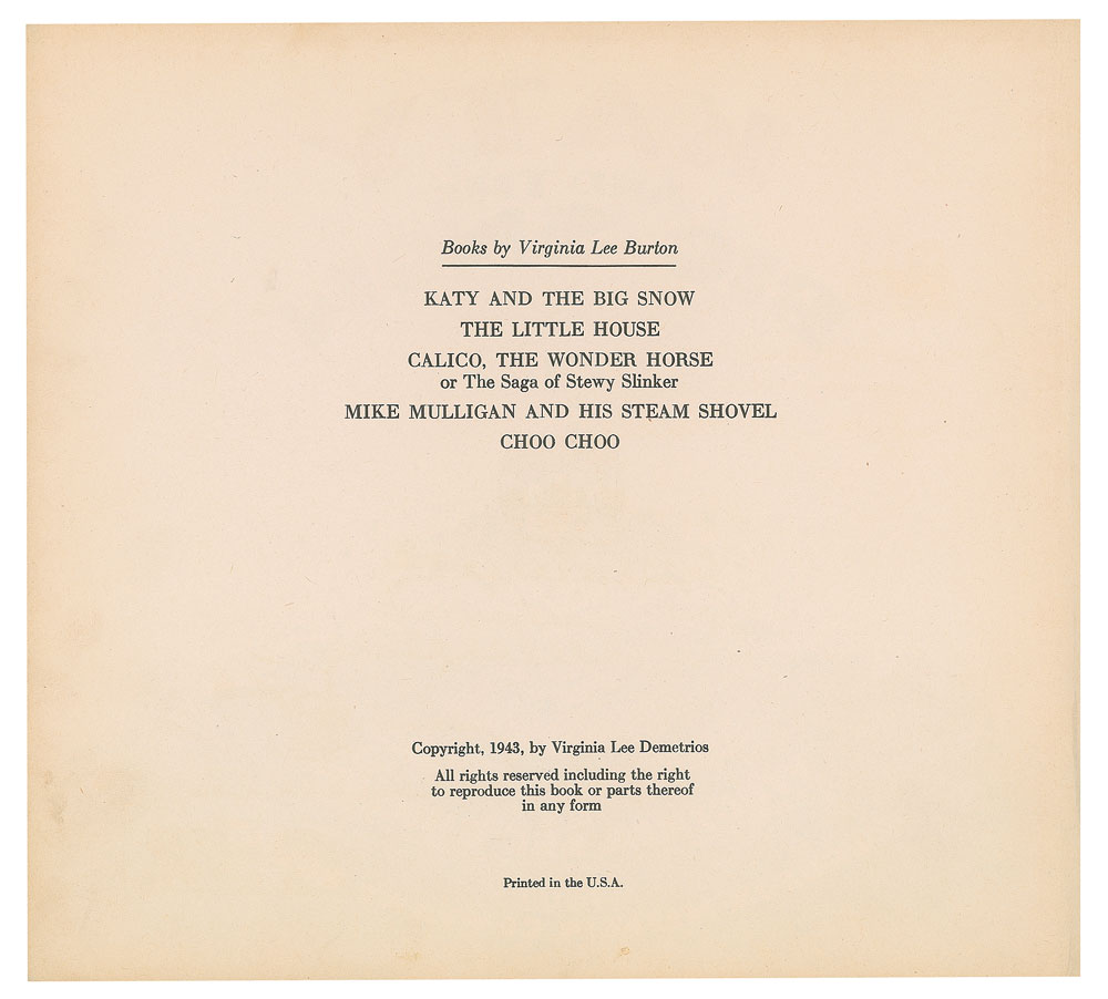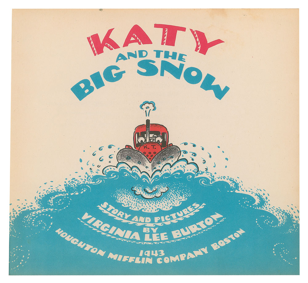 Unsigned first edition book: Katy and the Big Snow. First edition. Boston: Houghton Mifflin, 1943. Hardcover with dust jacket, 10 x 9, 36 pages. Book condition: VG/VG, with a gift inscription to the first free end page. In this classic children's story, Burton chronicles the adventures of Katy, the indomitable tractor snow plow, as she helps the town during a terrible blizzard.