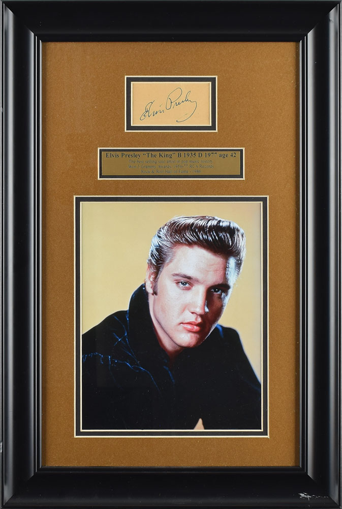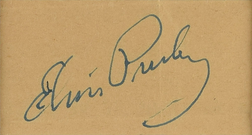 Bold felt tip signature, "Elvis Presley,” on a beige 3.25 x 1.75 slip. Nicely double-matted and framed with a portrait and nameplate to an overall size of 14 x 21. In fine condition, with a fold beneath the signature. Accompanied by a full letter of authenticity from JSA.