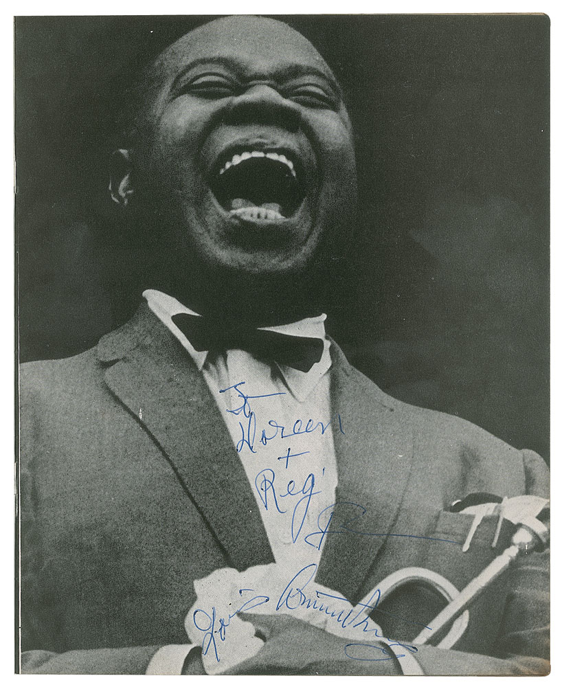 Program for Satchmo at the Variety Club, Batley, from June 17-30, 1968, 20 pages, 8 x 10, signed and inscribed inside on a full-page image in blue ballpoint, "To Doreen & Reg, From Louis Armstrong." In very good to fine condition, with light dampstaining to the covers.