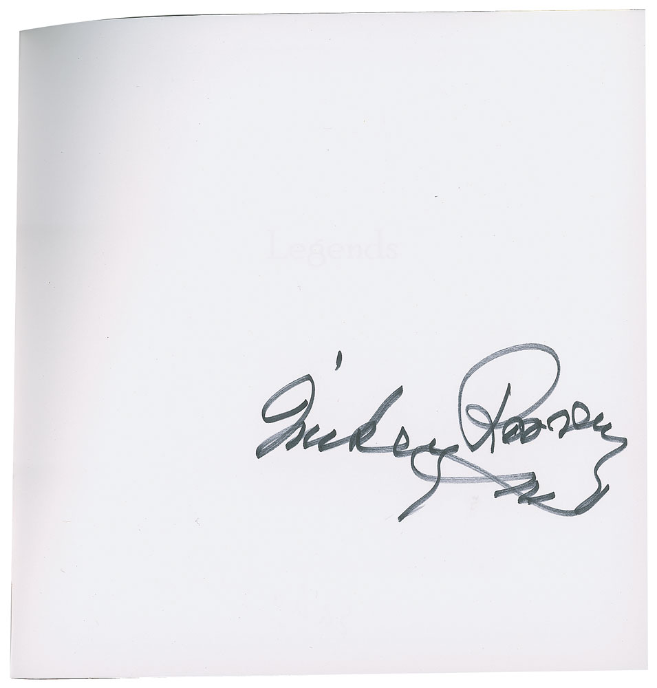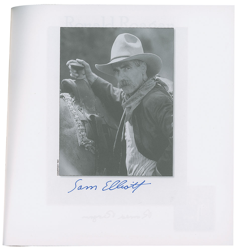 Signed book: Legends. Limited edition, numbered 225/250. Reno, Nevada: Jack Bacon and Company, 2006. Clothbound hardcover with slipcase, 9.25 x 9.75. Signed on their respective pages in blue felt tip by over 40 Western stars, including: James Arness, Eddy Arnold, Irene Bedard, Powers Boothe, Brooks and Dunn, Red Buttons, Harry Carey, Jr., Roy Clark, Lacy J. Dalton, Charlie Daniels, Jack Elam, Sam Elliott, Rhonda Fleming, Lou Glanzman, Lee Greenwood, Monte Hale, Emmylou Harris, Harry Jackson, Adam Jahiel, Stuart Kaminski, Thomas 'Doc' Kaminski, Frankie Laine, Trini Lopez, Barbara Mandrell, Kevin McCarthy, The Oak Ridge Boys, Hugh O'Brian, Riders in the Sky, Julie Ritter, Dale Robertson, Mickey Rooney, The Statler Brothers, Mel Tillis, Randy Travis, Eli Wallach, Dennis Weaver, and Adam West. In very fine condition. Accompanied by a certificate of authenticity from the publisher.
