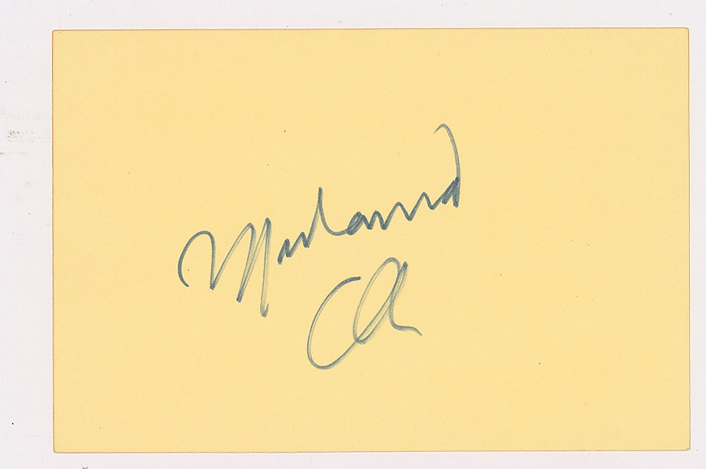 Felt tip signature, "Muhammad Ali,” on a yellow 6 x 4 card, with collector's notation on reverse dating the autograph to March 29, 1981. In very fine condition.