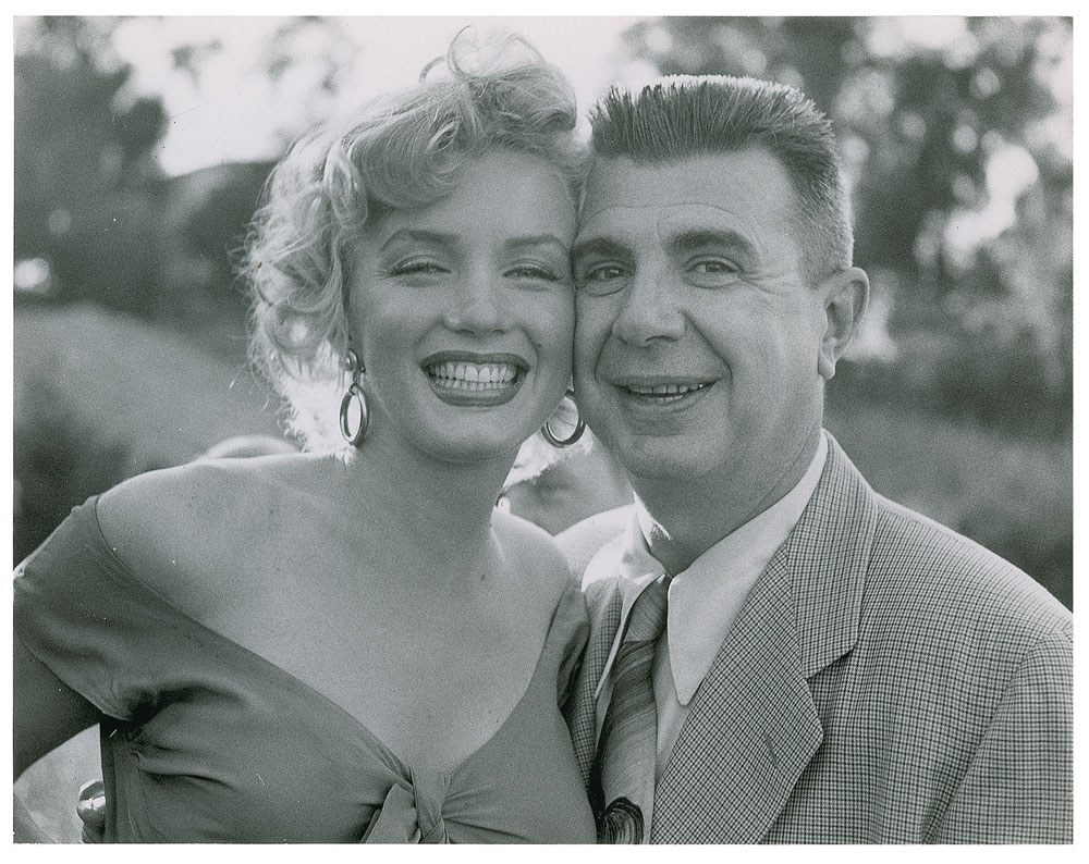 Original vintage glossy 9 x 7 silver gelatin photograph of Monroe and comedian Ken Murray in a side-by-side close-up shot. Reverse bears a Phil Stern/Photoplay credit stamp and Photoplay Magazine Library stamp, dated August 7, 1952. In fine condition, with a few light paperclip impressions to the left edge.