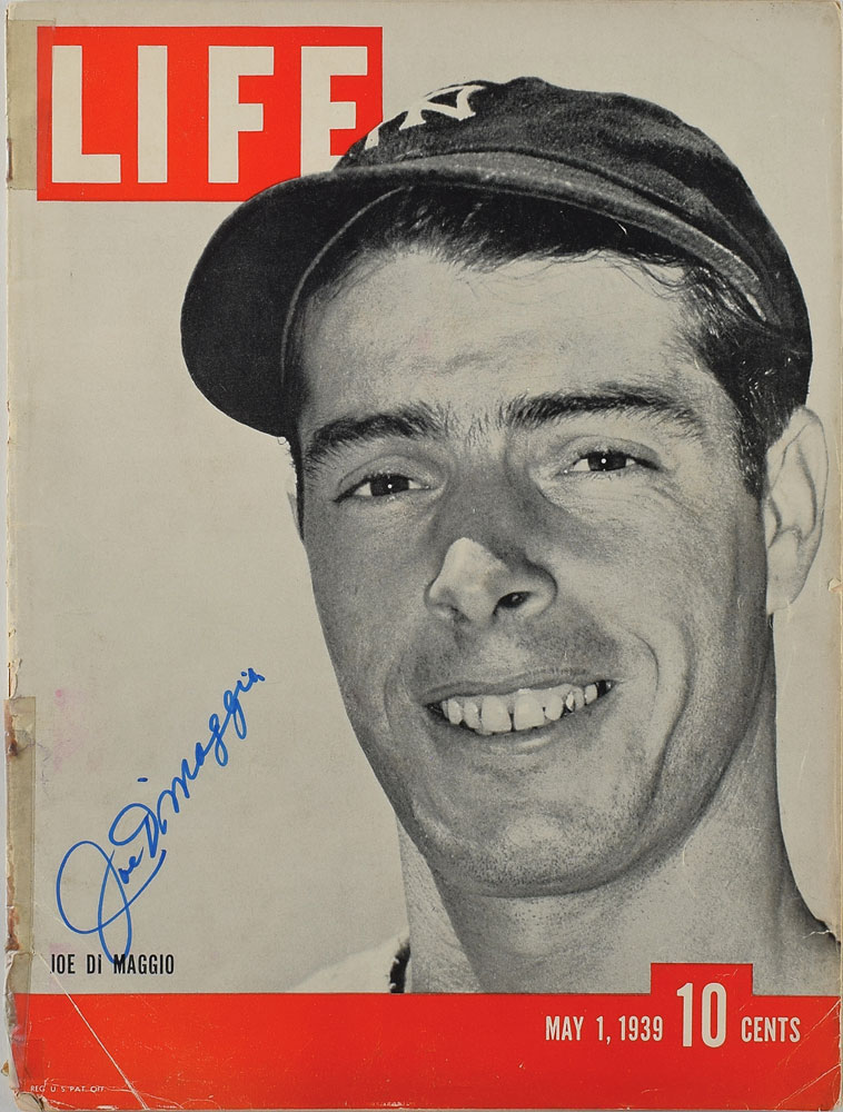 Issue of Life Magazine from May 1, 1939, featuring a huge close-up of Joe DiMaggio on the cover, 76 pages, 10.5 x 14, signed on the front cover in blue felt tip by DiMaggio. In very good condition, with creasing to corners, tape repairs to the spine, and top of the 'g' slightly touched up, probably by DiMaggio.