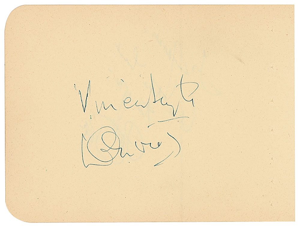 Vintage ink signatures, "Vivien Leigh" and "L. Olivier,” on an off-white 6 x 4.5 album page. Additionally, the reverse is signed by country music singer Patti Page. In fine condition, with light show-through from the Page signature on reverse.