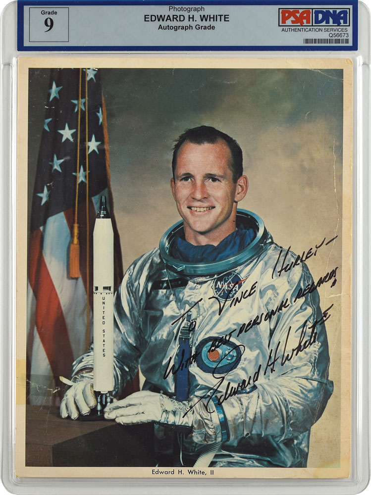 Official color 8 x 10 NASA lithograph of White posing in his silver Gemini space suit with a Titan rocket model, signed and inscribed in black felt tip, "To Vince Hurley—with best personal regards, Edward H. White II.” Encapsulated by PSA/DNA, with the signature graded "9." In very good condition, with creasing to the top, heavier creasing to the right side, and a tear to the left side repaired with old scotch tape. Accompanied by a full letter of authenticity from PSA/DNA.