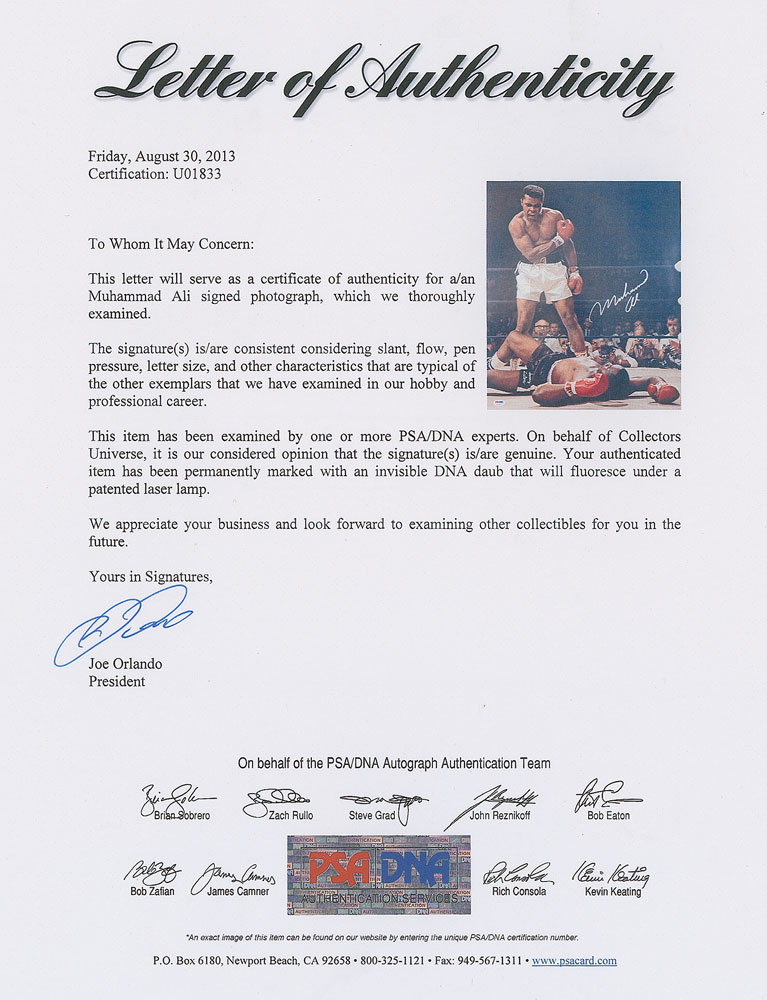 Impressive color satin-finish 16 x 20 full-length photo of Muhammad Ali towering over the fallen Sonny Liston during their rematch, signed in silver ink by Ali. In fine condition, with a very small tear to the background to the left of Ali's head and a PSA/DNA label affixed to lower left corner. Accompanied by a full letter of authenticity from PSA/DNA.