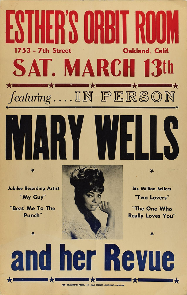 Original color 14 x 22 window card for a Mary Wells concert at Esther's Orbit Room in Oakland, California, on March 13, 1965, showing an image of Wells with titles of her hit singles: 'My Guy,' 'Beat Me to the Punch,' 'Two Lovers,' and 'The One Who Really Loves You.' Printed by Tilghman Press of Oakland. In very good to fine condition, with light rippling and a central vertical crease.