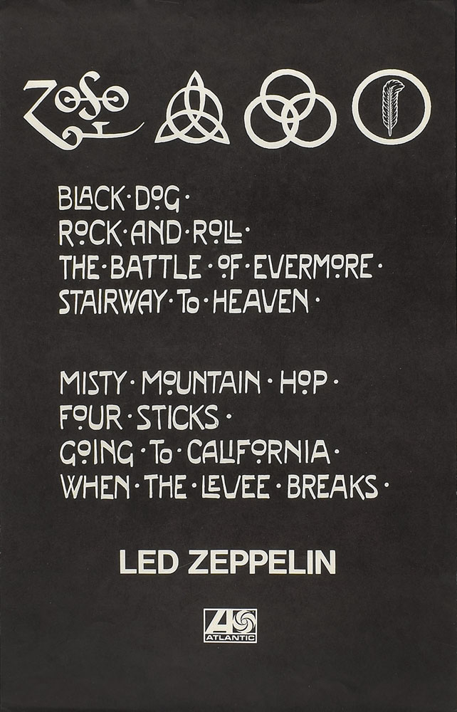 Original 14 x 22 Atlantic Records promo poster for Led Zeppelin's fourth studio album, released in 1971, featuring the classic track listing: "Black Dog," "Rock and Roll," "The Battle of Evermore," "Stairway to Heaven," "Misty Mountain Hop," "Four Sticks," "Going to California," and "When the Levee Breaks." In fine condition.
