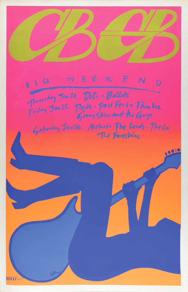Vibrantly colored 22.25 x 34.5 screen print for the three CBGB 'Big Weekend' concerts held between January 24-26, 1980, with the scheduled performers as follows: Dots, Bullets, Decks, Fast Food, Thin Ice, Sonny Skies and the Guys, Method, The Lords, The Go, and The Foreskins. In fine condition.