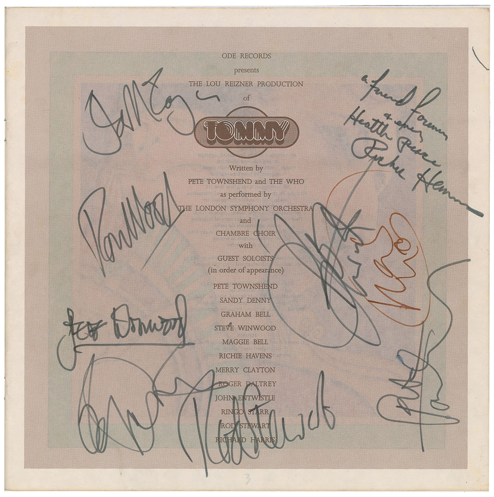 Booklet included with the album box set for Tommy, the 1972 album by the London Symphony Orchestra, signed on the first page in brown felt tip by Keith Moon, and in black felt tip by Pete Townshend, Roger Daltrey, John Entwistle, Steve Winwood, Ronnie Wood (who also adds a Rod Stewart signature), Ian McLagan, and Richie Havens, who adds "A friend forever & ever, health peace." In fine condition. The records, album sleeve, and slipcase are all included.