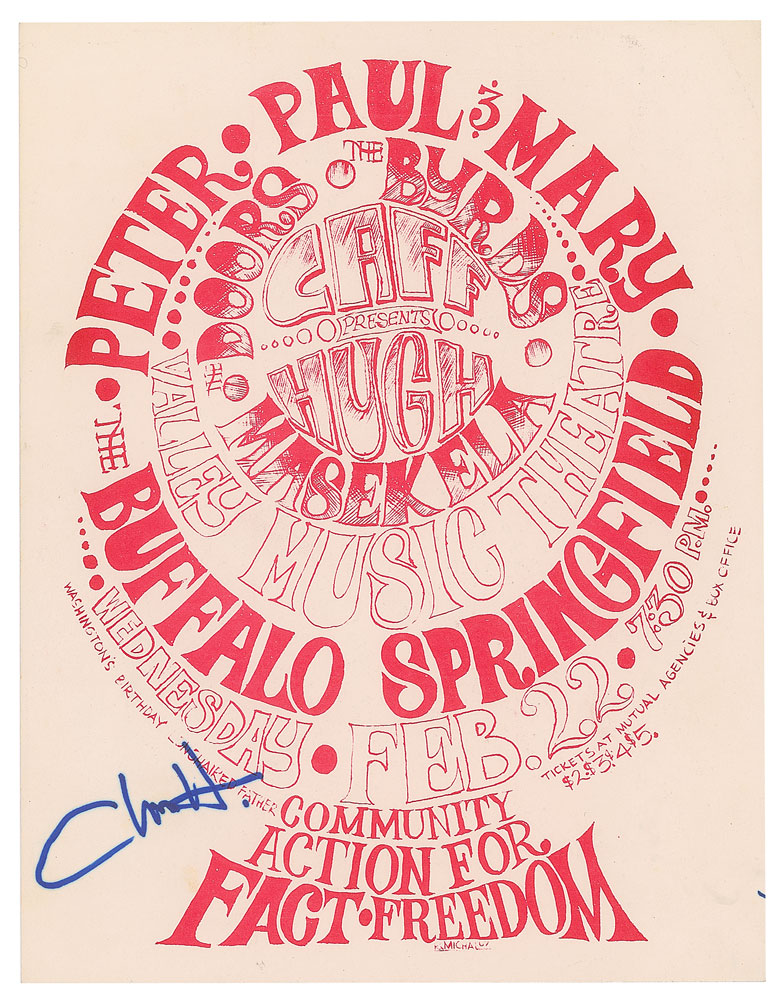 Original color 8.5 x 11 handbill for The Doors, The Byrds, Peter, Paul & Mary, Buffalo Springfield, and Hugh Masekela at the Valley Music Theatre in Woodland Hills on February 22, 1967, signed in blue felt tip by Byrds guitarist Chris Hillman. In fine condition.