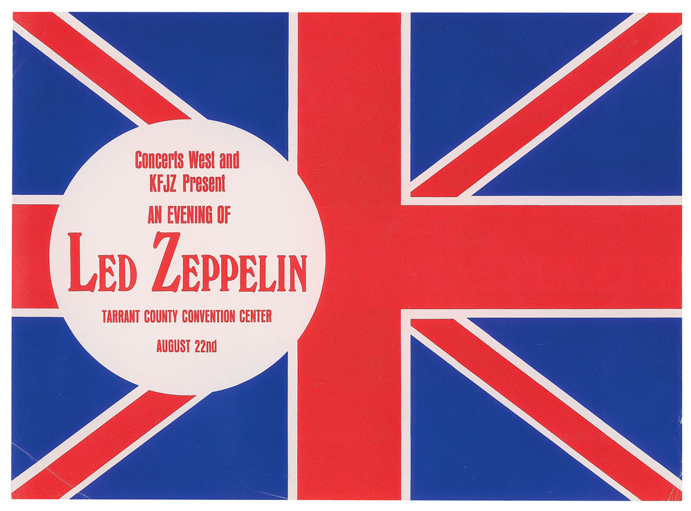 Hugely appealing color 11.75 x 8.5 'Union Jack' handbill for a Led Zeppelin concert at the Tarrant County Convention Center in Fort Worth, Texas, on August 22, 1970. In fine condition, with creasing to the corners. Led Zeppelin set a new rock music attendance record in Fort Worth when they packed nearly 14,000 excited fans into the auditorium of the Tarrant County Convention Center.