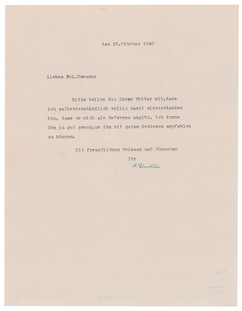 TLS in German, signed “A. Einstein,” one page, 8.5 x 11, blindstamped Princeton letterhead, October 29, 1940. Letter to Miss Betty Neumann, in full (translated): "Please tell your cousin that I completely agree that he gives me as a reference. I know him well enough to recommend him with a clear conscience." In fine condition. Accompanied by the original mailing envelope.