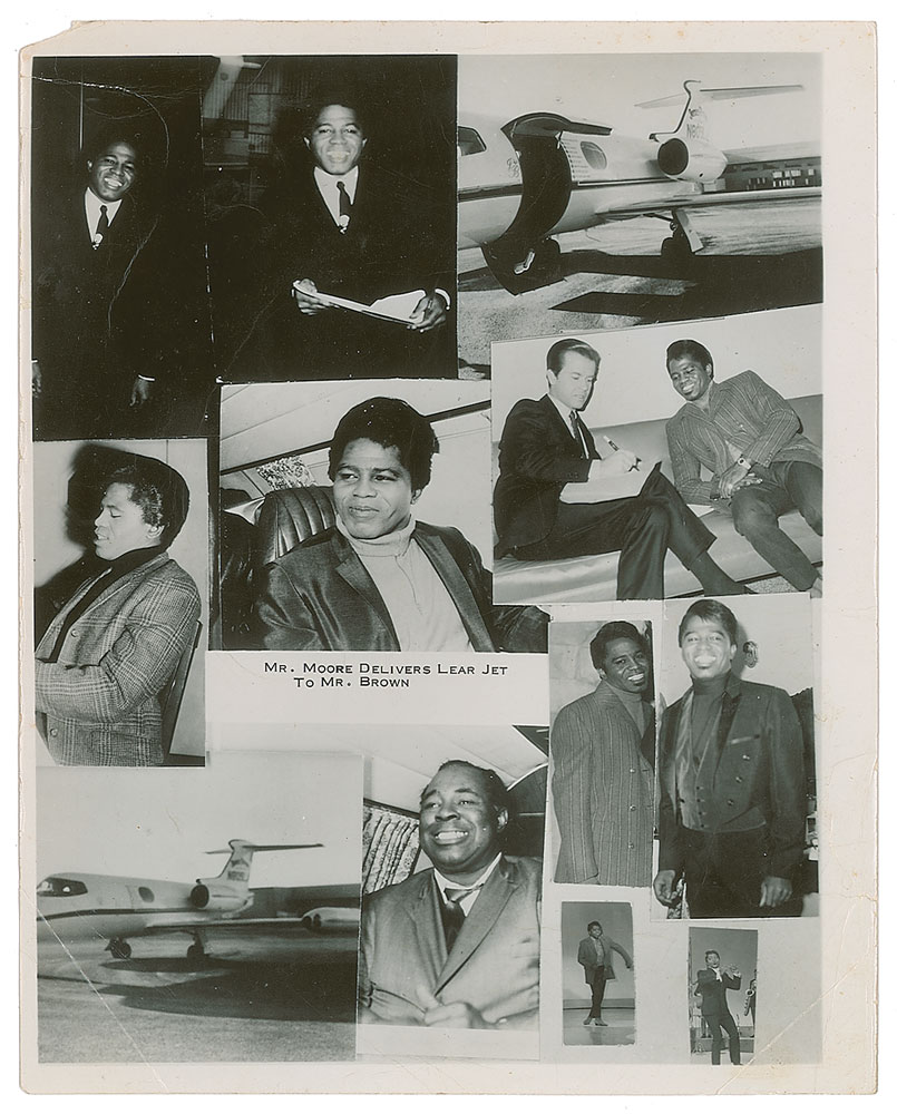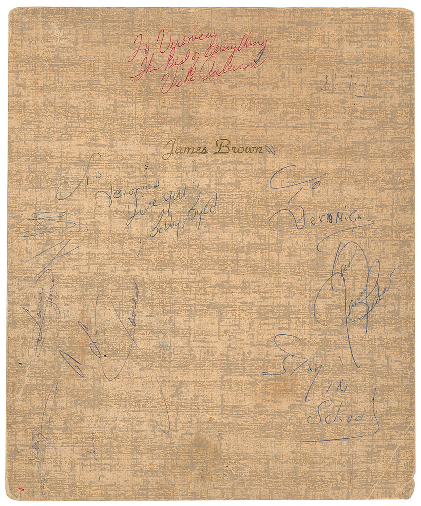 Cardstock folio cover with "James Brown" embossed in gold, 9 x 11, signed in ballpoint by James Brown, his longtime close associate and Famous Flame singer Bobby Byrd, and Brown singer Vicki Anderson, all adding inscriptions to "Veronica." In very good condition, with moderately heavy overall creasing to both the folio cover and the photograph. Accompanied by an original glossy 8 x 10 composite photo of Brown receiving his 1965 Learjet 23, which made him the first African-American to own a private jet.
