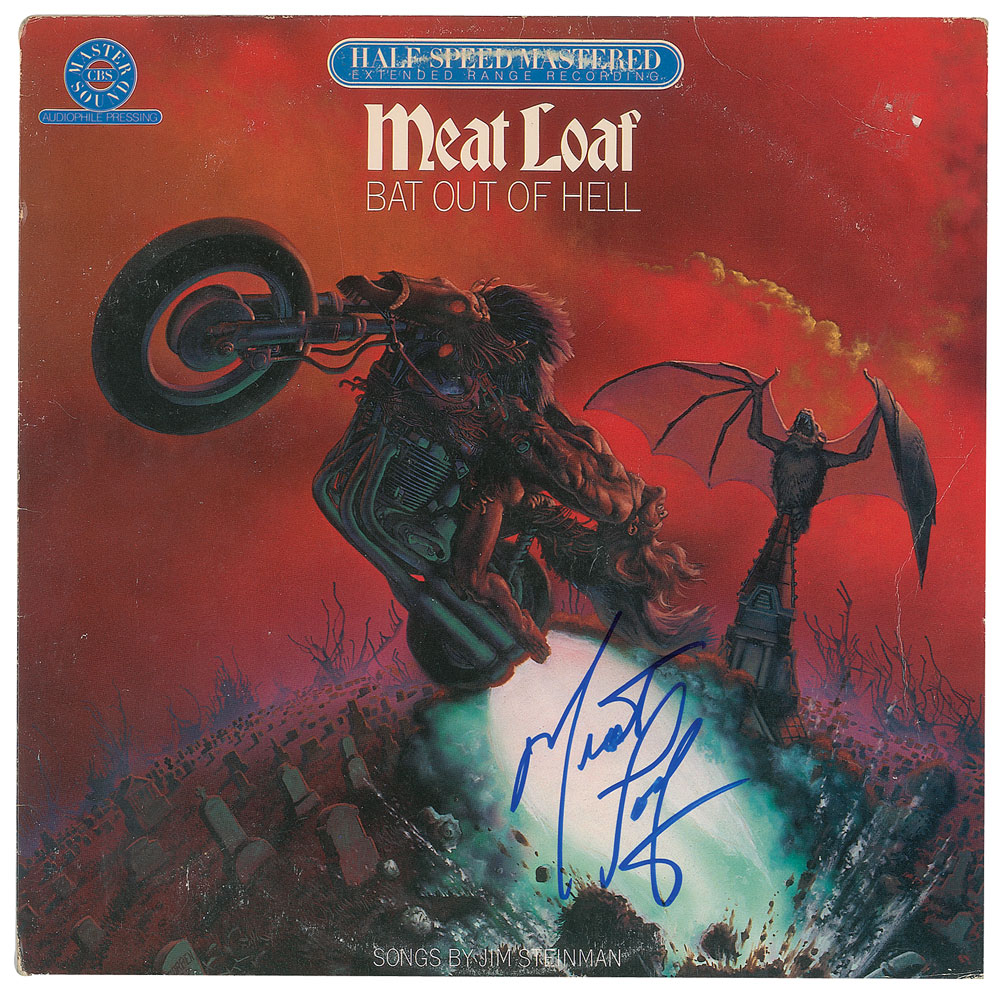 Bat Out of Hell album signed on the front cover in blue felt tip by Meat Loaf. In very good to fine condition, with light scuffing, creasing, and old price sticker residue. The record is included. From The John Brennan In-person Autograph Collection.