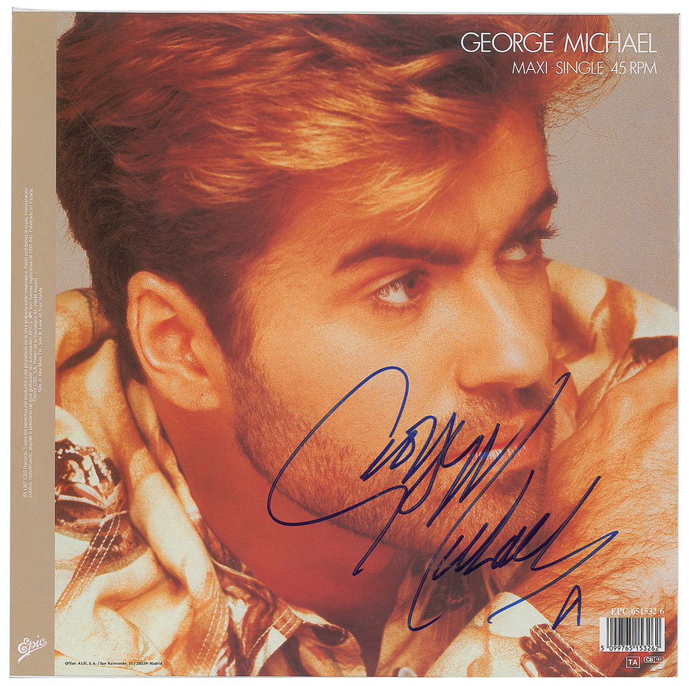 'One More Try' single album signed on the back cover in blue felt tip by George Michael. In fine condition. The record is included. From The John Brennan In-person Autograph Collection.