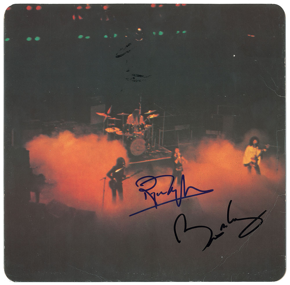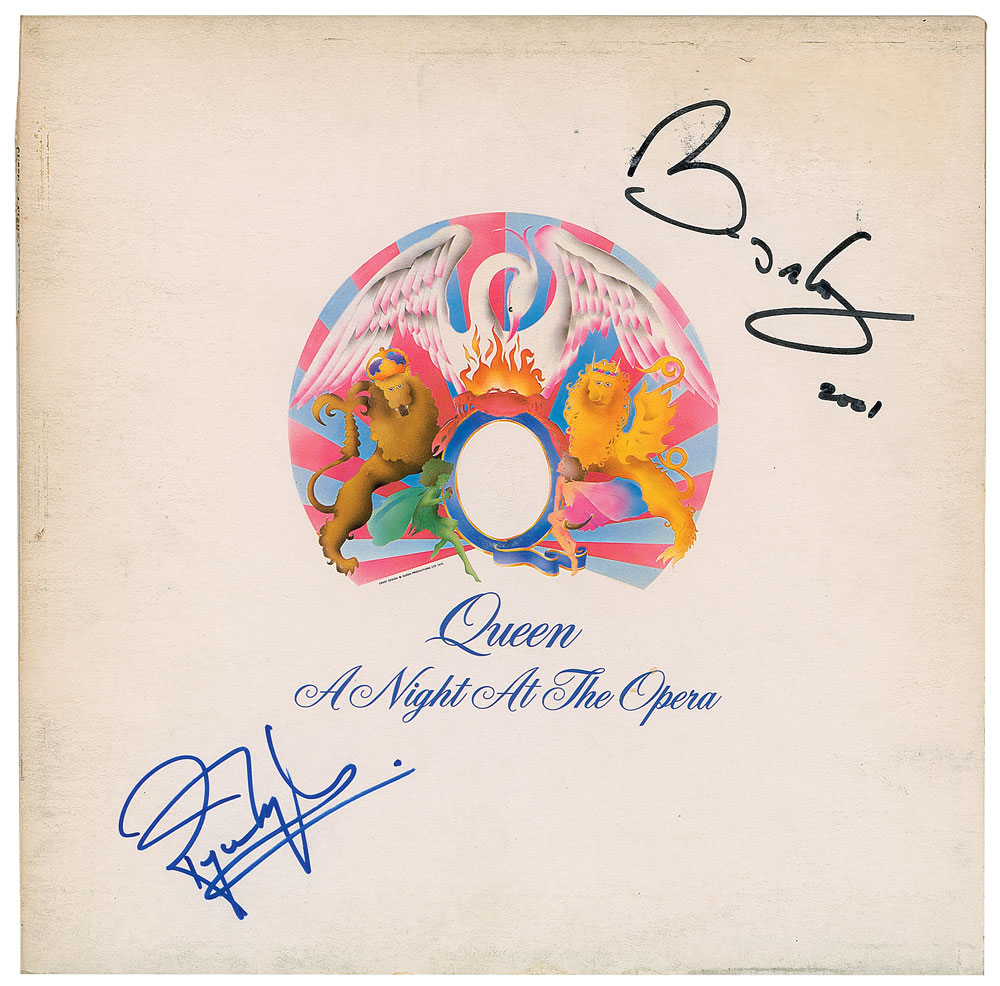 A Night at the Opera album signed on the front cover in black felt tip, "Brian May, 2001," and in blue felt tip, "Roger Taylor," with both musicians signing again on the visually appealing inner sleeve. In fine condition, with some light soiling. The record is included. From The John Brennan In-person Autograph Collection.
