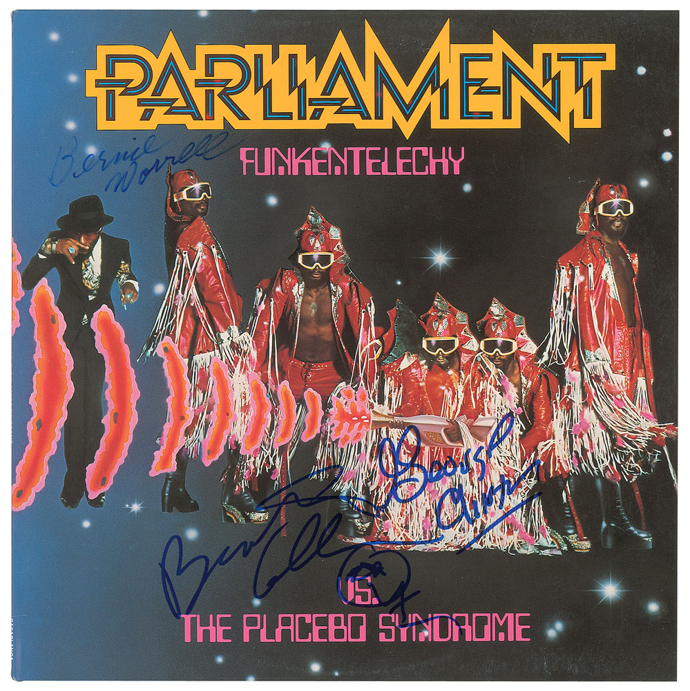 Funkentelechy vs. the Placebo Syndrome album signed on the front cover in blue felt tip by George Clinton, Bernie Worrell, and Bootsy Collins. In fine condition. The record is included. From The John Brennan In-person Autograph Collection.