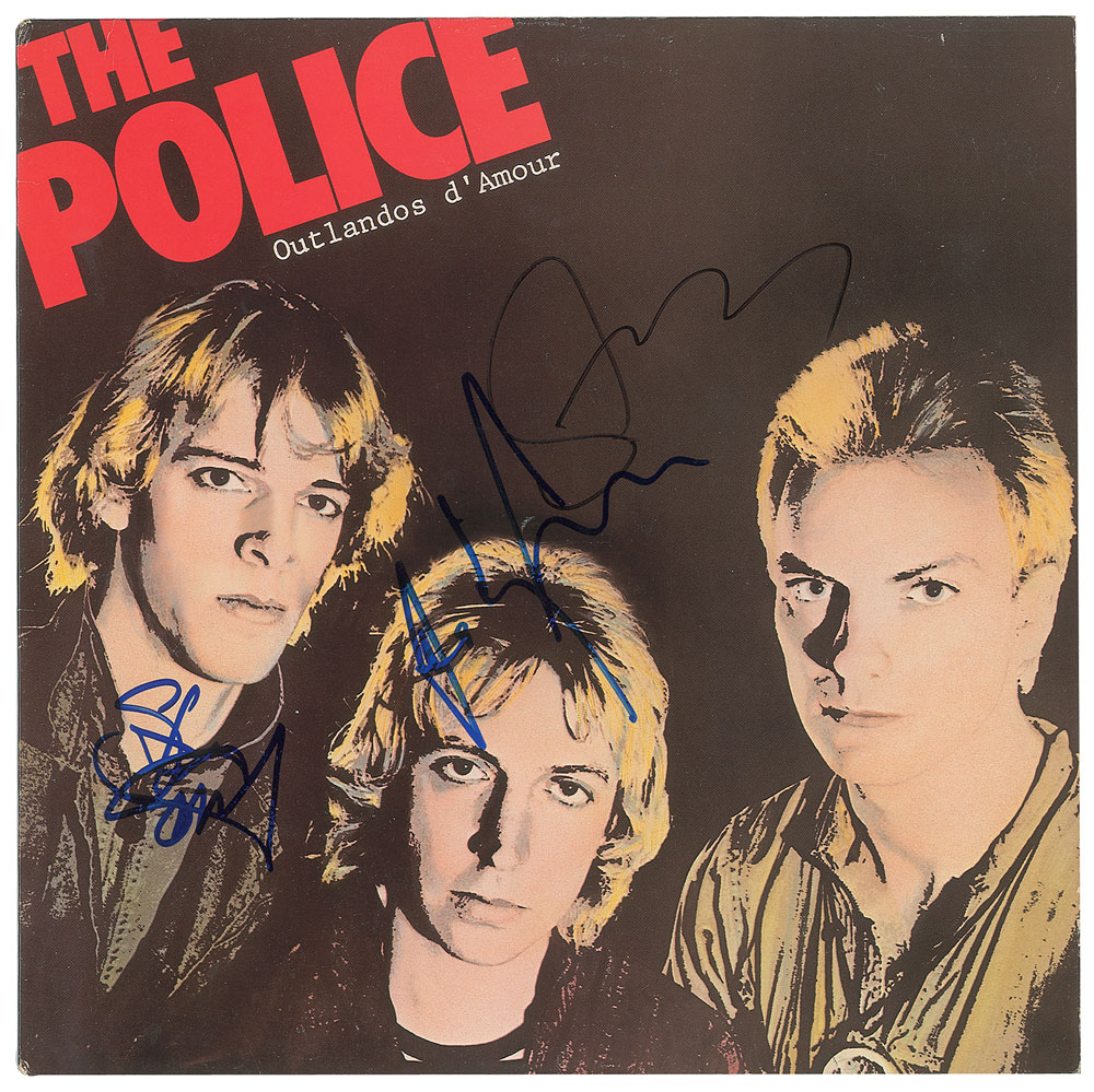Outlandos d'Amour album signed on the front cover in blue felt tip by Andy Summers, Stewart Copeland, and Sting. In fine condition. The record is included. From The John Brennan In-person Autograph Collection.