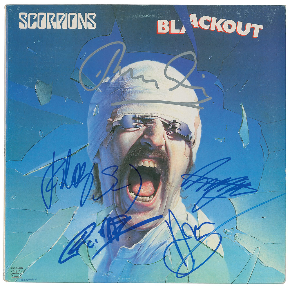 Blackout promotional album signed on the front cover in blue felt tip by Rudolf Schenker, Klaus Meine, Francis Buchholz, Herman Rarebell, and Matthias Jabs. In fine condition. The record is included. From The John Brennan In-person Autograph Collection.