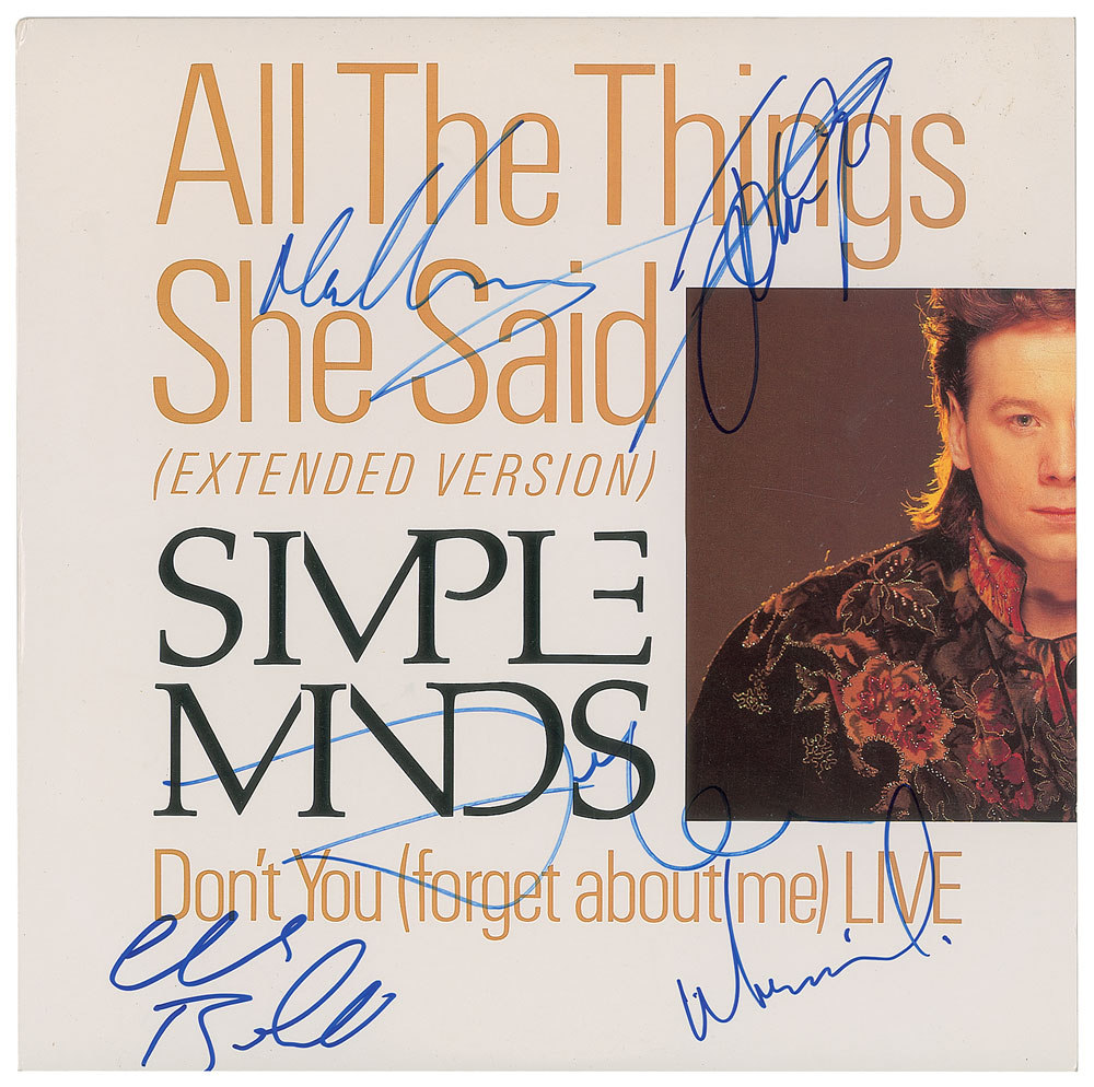 'All the Things She Said' promotional single album signed on the front cover in blue felt tip by John Giblin, Jim Kerr, Charlie Burchill, Mel Gaynor, and Mick MacNeil. In fine condition. The record is included. From The John Brennan In-person Autograph Collection.