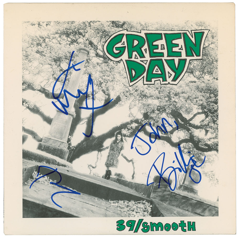 39/Smooth album by Green Day, signed and inscribed on the front cover in blue felt tip by Billie Joe Armstrong, Tre Cool, and Mike Dirnt. In fine condition. The record is included. From The John Brennan In-person Autograph Collection.