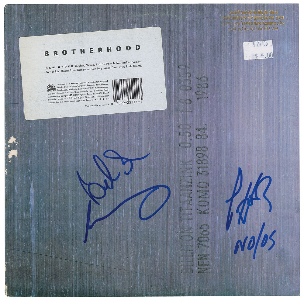Brotherhood promotional album signed Bernard Sumner, Stephen Morris, and Peter Hook. In fine condition, with an affixed price sticker, and some surface loss to the left edge. The record is included. From The John Brennan In-person Autograph Collection.