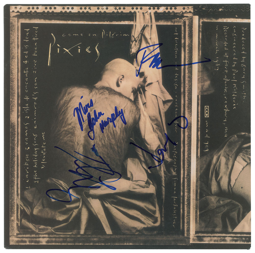 Come On Pilgrim album by the Pixies, signed on the front cover in blue felt tip by Black Francis, Kim Deal (as Mrs. John Murphy), David Lovering, and Joey Santiago. In fine condition. The record is included. From The John Brennan In-person Autograph Collection.