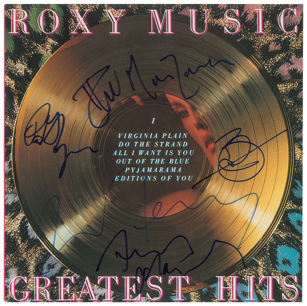 Greatest Hits album from Roxy Music, signed on the front cover in blue felt tip by Paul Thompson, Brian Eno, Bryan Ferry, Andy Mackay, and Phil Manzanera. In fine condition. The record is included. From The John Brennan In-person Autograph Collection.