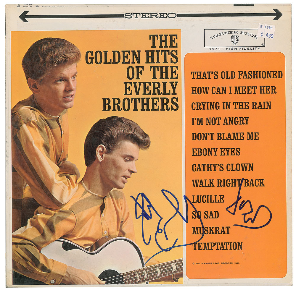 The Golden Hits of the Everly Brothers album signed on the front cover in blue felt tip by Don and Phil Everly. In fine condition, with an affixed price sticker. The record is included. From The John Brennan In-person Autograph Collection.