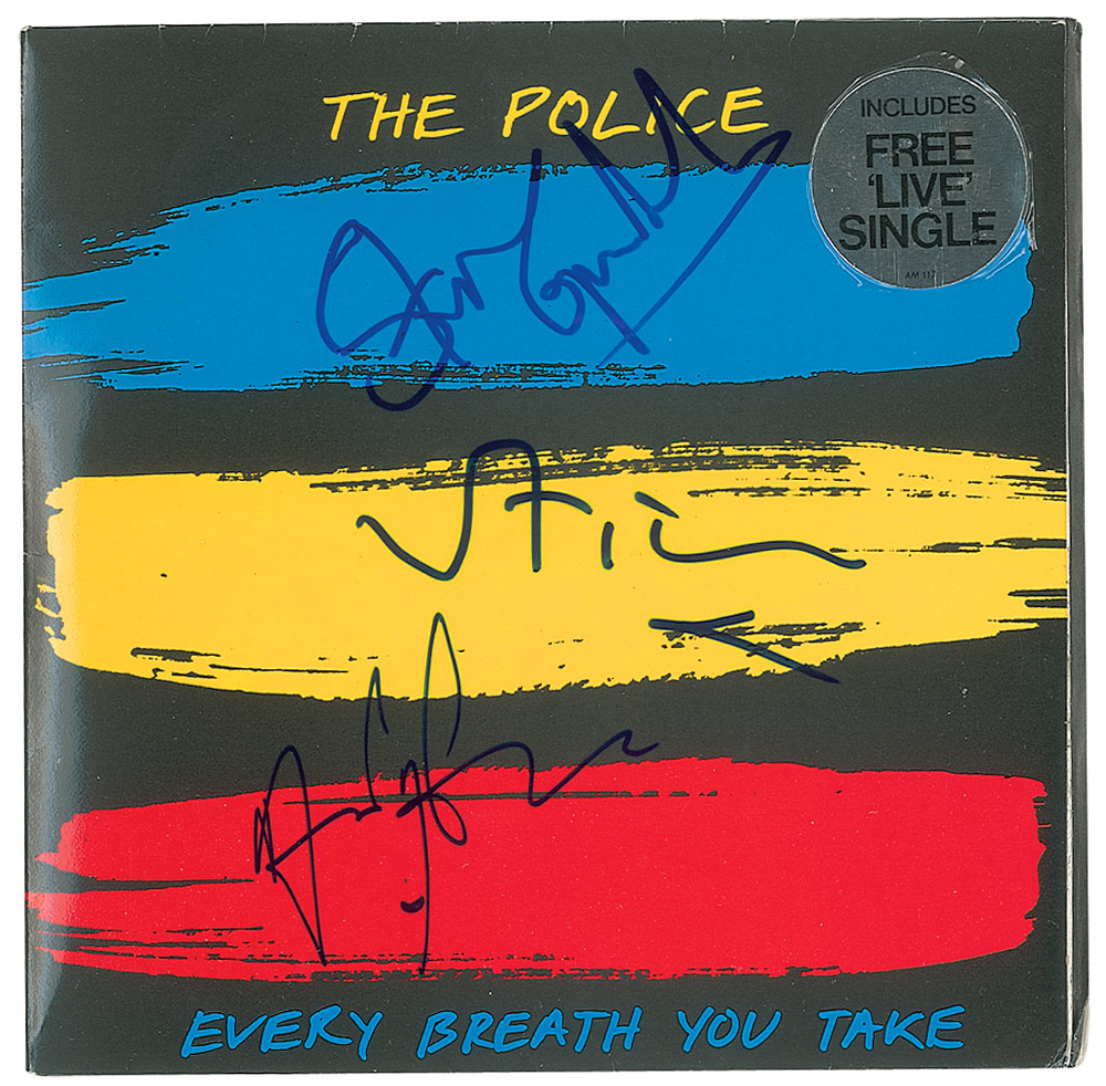 A&M Records 45 RPM single record for 'Every Breath You Take / Murder by Numbers' by The Police, signed on the front cover in blue felt tip by Sting, Stewart Copeland, and Andy Summers. In fine condition, with creasing to the upper right corner. From The John Brennan In-person Autograph Collection.