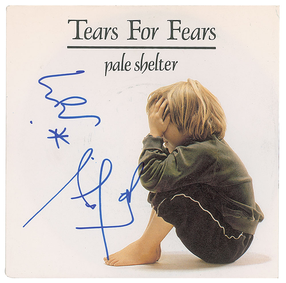 Mercury Records 45 RPM single record for 'Pale Shelter / We Are Broken' by Tears for Fears, signed on the front cover in blue felt tip by Roland Orzabal and Curt Smith. In fine condition. The record is included. From The John Brennan In-person Autograph Collection.