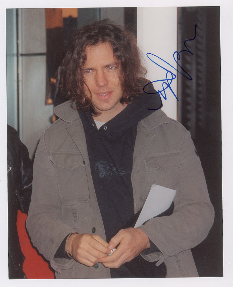 Color glossy 11 x 13.75 half-length photo of Eddie Vedder in a candid moment during his early Pearl Jam days, signed in blue felt tip. In fine condition. From The John Brennan In-person Autograph Collection.
