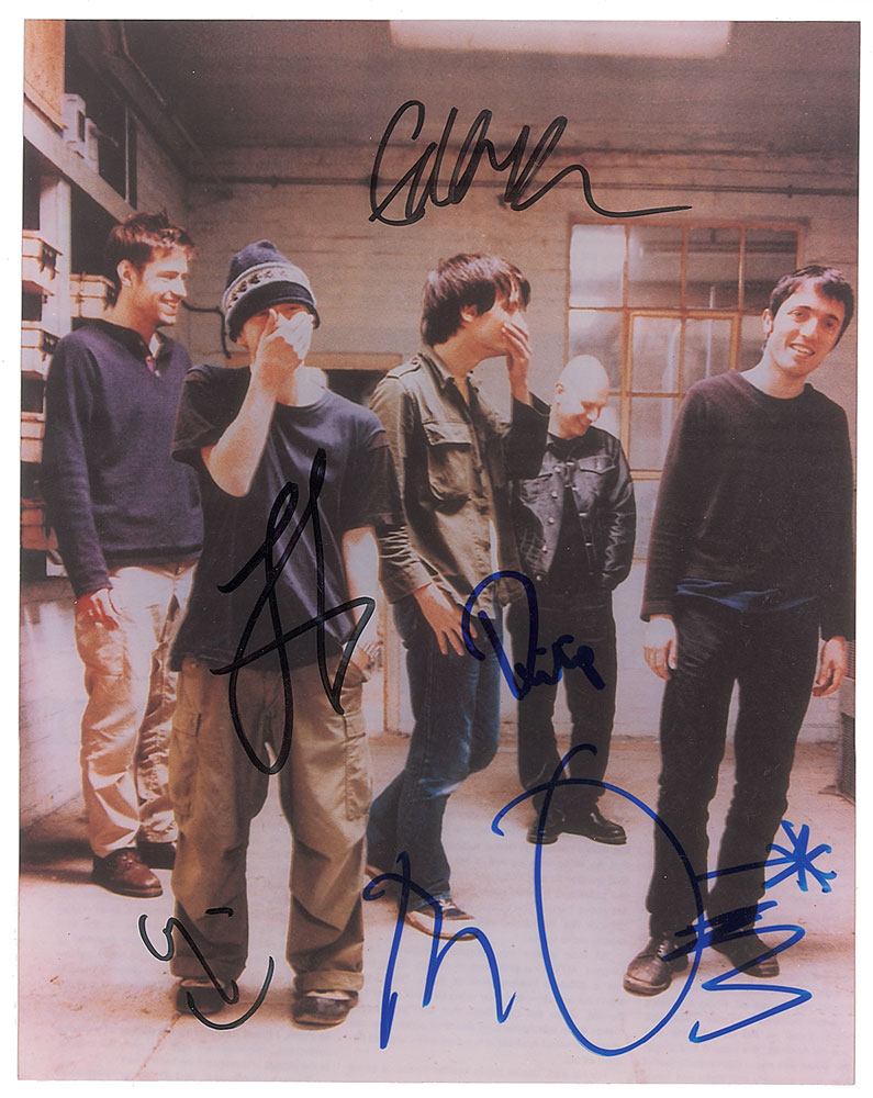 Color glossy 8 x 10 photo of Radiohead earlier in their careers, signed in blue or black felt tip by Thom Yorke, Jonny Greenwood, Colin Greenwood, Ed O'Brien, and Philip Selway. In very fine condition. From The John Brennan In-person Autograph Collection.