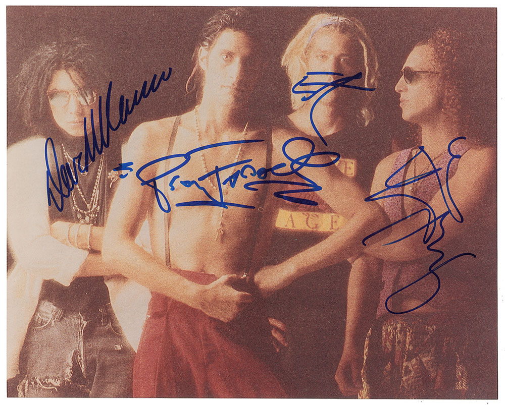 Color glossy 10 x 8 band photo of Jane's Addiction, signed in blue felt tip by Perry Farrell, Eric Avery, Dave Navarro, and Stephen Perkins. In fine condition, with somewhat fuzzy image quality. From The John Brennan In-person Autograph Collection.