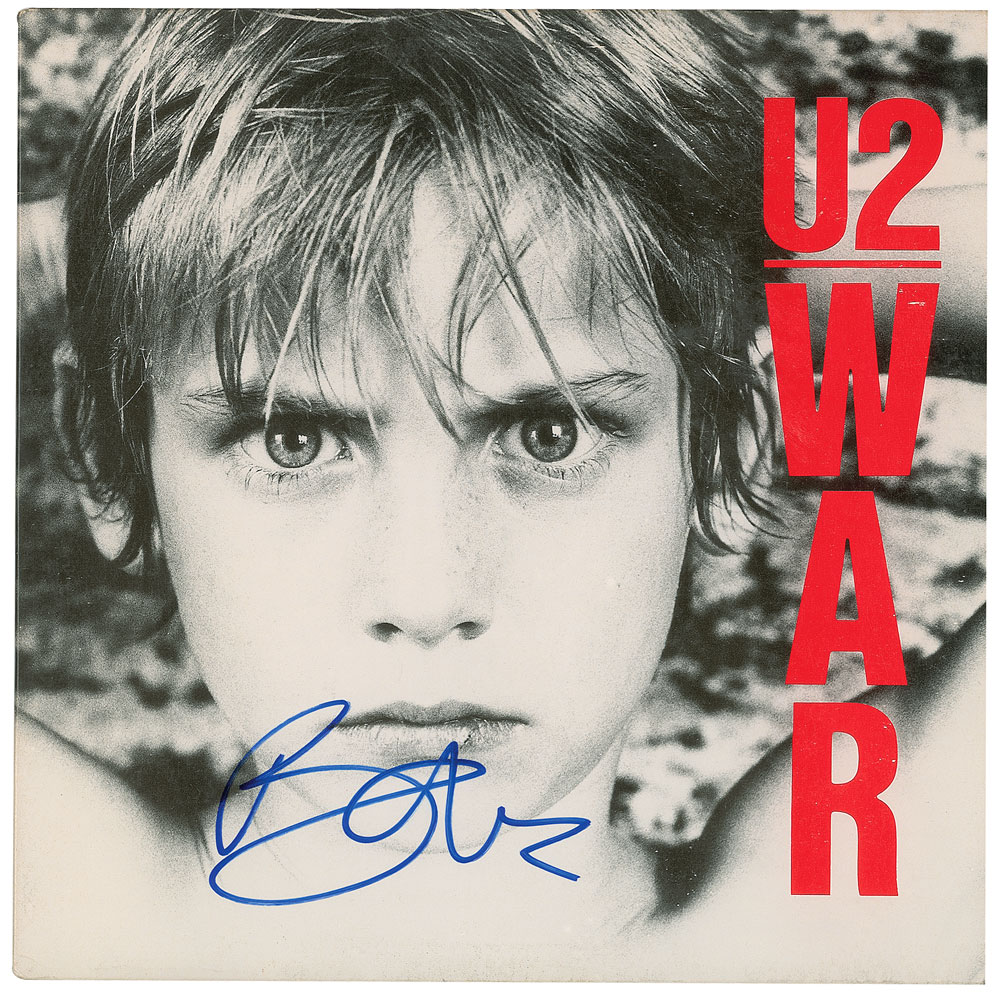 War album by U2, signed on the front cover in blue felt tip by Bono. In fine condition. The record is included. From The John Brennan In-person Autograph Collection.