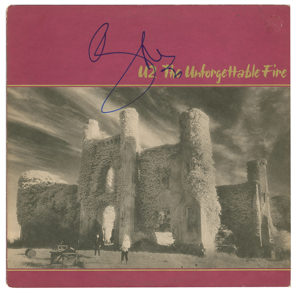 The Unforgettable Fire album by U2, signed on the front cover in blue felt tip by Bono. In fine condition, with price sticker residue to the upper right corner. The record is included. From The John Brennan In-person Autograph Collection.