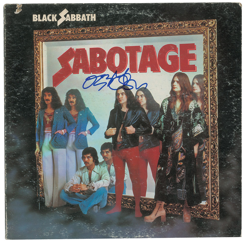 Sabotage album by Black Sabbath, signed on the front cover in blue felt tip by Ozzy Osbourne. In very good to fine condition, with light scuffing, and a discount cut to the top edge. The record is included. From The John Brennan In-person Autograph Collection.