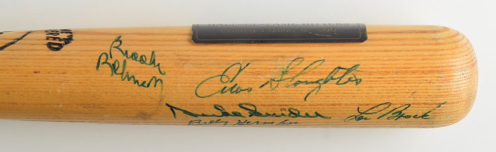Official Louisville Slugger baseball bat signed in blue felt tip on the barrel by ten Hall of Fame hitters, including: Willie Mays, Harmon Killebrew, Willie McCovey, Johnny Mize, Brooks Robinson, Enos Slaughter, Duke Snider, Lou Brock, Billy Herman, and Lou Boudeau. An engraved plaque affixed to the barrel denotes the bat as "1st Series, Hall-of-Fame Hitters, Limited Edition of 500." In fine condition, with a few light scuffs and scratches (including one slightly affecting Slaughter's last name).
