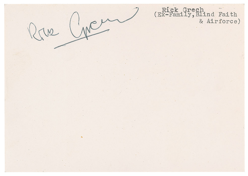 Ink and ballpoint signatures of all four Blind Faith members—Eric Clapton, Steve Winwood, Ric Grech, and Ginger Baker—on individual slips or sheets ranging in size from 3 x 1.5 to 4.5 x 5.75. In overall very good to fine condition, with show-through from print on the back of the Clapton slip.