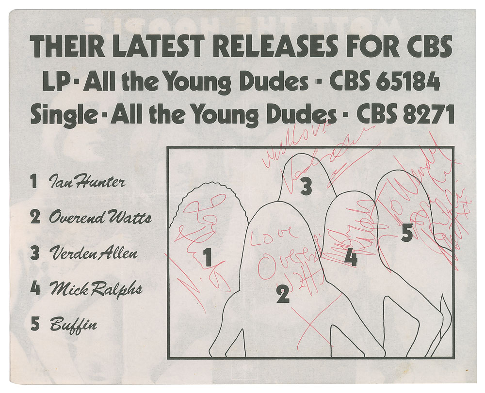 Desirable 10 x 8 CBS Records promotional flyer for Mott the Hoople, signed on the reverse in their respective silhouettes in red ballpoint by Ian Hunter, Pete Overend Watts, Verden Allen, Mick Ralphs, and Dale "Buffin" Griffin, who adds an inscription to "Wendy." Bold text on the reverse reads: "Their Latest Releases for CBS, LP—All the Young Dudes—CBS 65184." In very good to fine condition, with light creasing and intersecting folds.