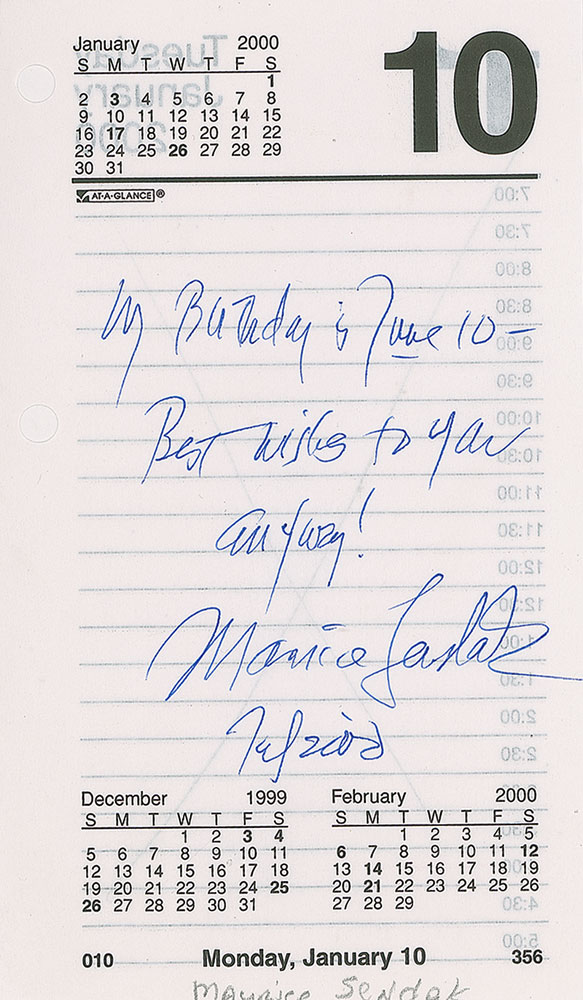 ANS on a lightly lined 3.5 x 6 desk calendar page for January 10, 2000, in full: "My birthday is June 10—Best wishes to you anyway! Maurice Sendak." In fine condition.