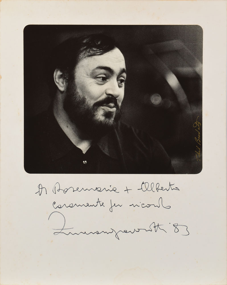 Large semi-glossy 12.5 x 10.5 portrait of the great tenor affixed to a 16 x 20 mount, prominently signed and inscribed on the mount in black felt tip by Pavarotti. The photo is signed vertically along the right edge in gold ink by the photographer. Reverse bears a Phil Brodatz Photography label and stamp. In very good to fine condition, with light overall scratching to the image, scattered light foxing, and a light stain to the lower edge of the mount.