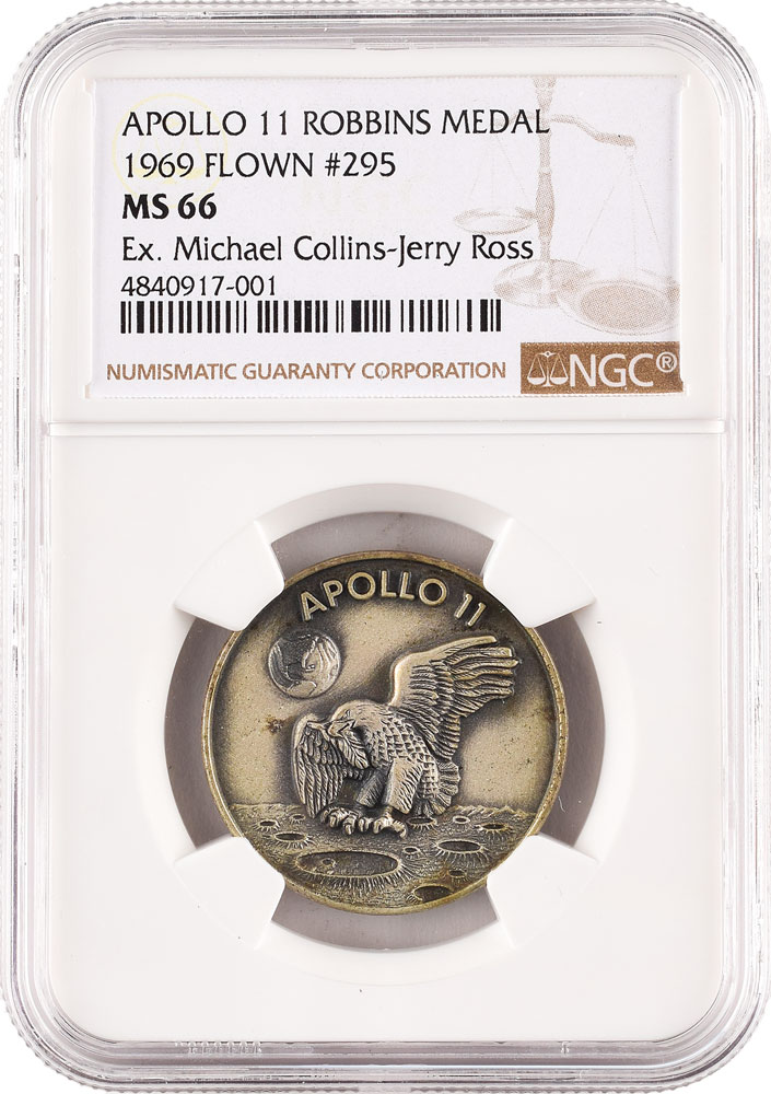 Historic flown sterling silver Apollo 11 Robbins medal, approximately 1.25″ diameter, with the face featuring an early design of the iconic Apollo 11 mission insignia raised in high relief, showing the eagle carrying the olive branch in its beak. The reverse bears the last names of astronauts Neil Armstrong, Buzz Aldrin, and Michael Collins, and is engraved with the launch date of July 16, 1969, moon landing date of July 20, 1969, and return date of July 24, 1969. The medal is serial numbered "295." Encapsulated and graded by NGC as "MS 66," with the label noting the provenance, "Ex. Michael Collins-Jerry Ross."