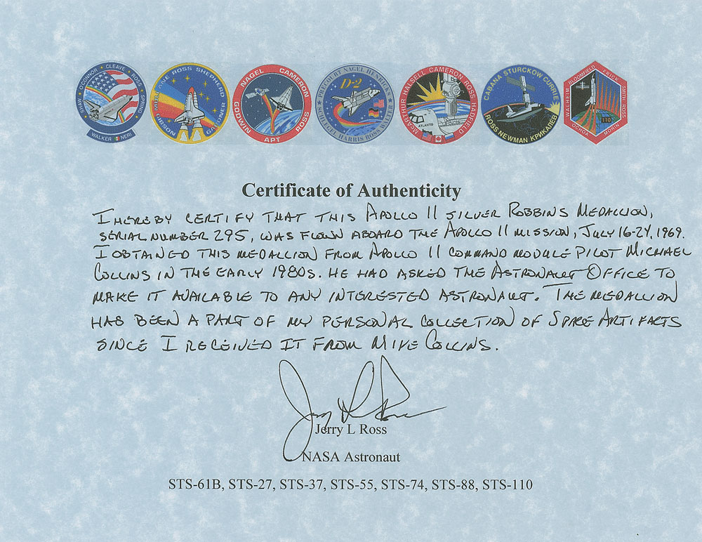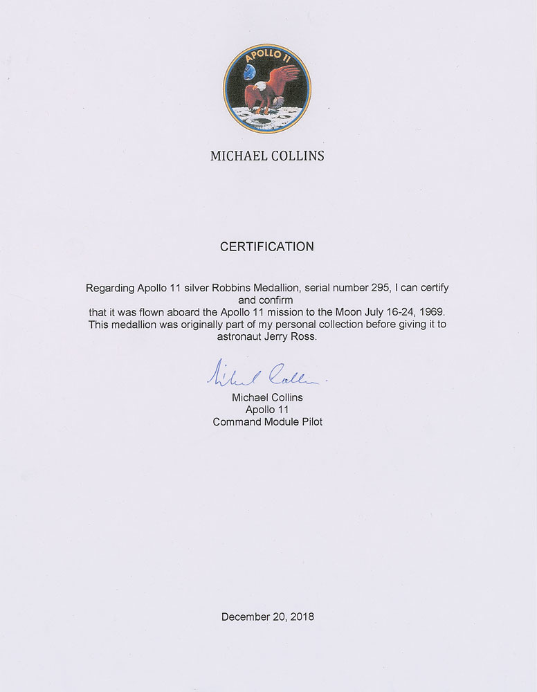 Accompanied by a typed letter of provenance signed by Apollo 11 Command Module Pilot Michael Collins, in full: "Regarding Apollo 11 silver Robbins Medallion, serial number 295, I can certify and confirm that it was flown aboard the Apollo 11 mission to the Moon July 16-24, 1969. The medallion was originally part of my personal collection before giving it to Jerry Ross." Also includes a handwritten letter of provenance signed by Space Shuttle astronaut Jerry Ross, who flew on seven STS missions, in part: "I obtained this medallion from Apollo 11 Command Module Pilot Michael Collins in the early 1980s. He had asked the Astronaut Office to make it available to any interested astronaut. The medallion has been a part of my personal collection of space artifacts since I received it from Michael Collins." A superb and beautiful example of the most sought-after Robbins medallion, enhanced by its dual-certification by two distinguished astronauts.