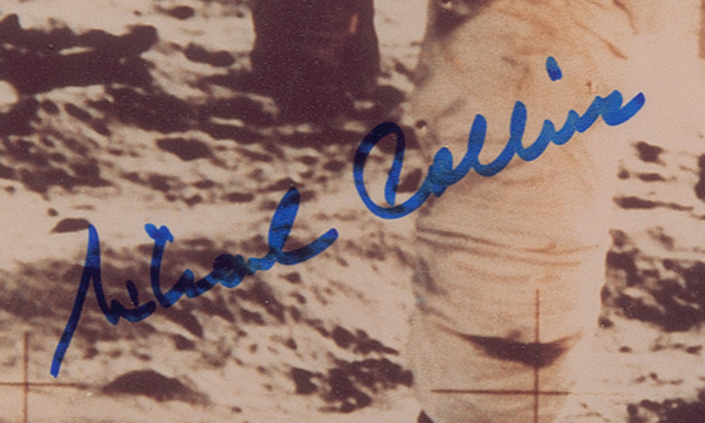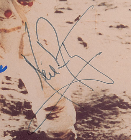 Simply magnificent color satin-finish 8 x 10 photo of LMP Buzz Aldrin standing on the lunar surface, his visor showing a small reflection of the photographer, CDR Neil Armstrong, signed in black felt tip by Aldrin and Armstrong, and in blue felt tip by Michael Collins. In fine condition. An extraordinary fully signed example of the most iconic image from the historic Apollo 11 mission—one of only a few we have ever offered. Accompanied by a certificate of authenticity for the Collins signature from a private signing held by Astronaut Central.