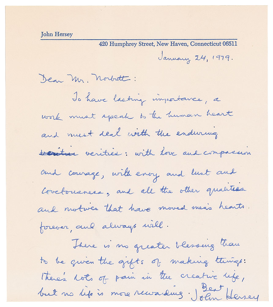 Pulitzer Prize-winning writer and journalist (1914-1993) considered one of the earliest practitioners of 'New Journalism.' ALS, one page, 6.25 x 7, personal letterhead, January 24, 1979. Letter to "Mr. Norbutt," in full: "To have lasting importance, a work must speak to the human heart and must deal with the enduring verities: with love and compassion and courage, with envy and lust and covetousness, and all the other qualities and motives that have moved men's hearts forever, and always will. There is no greater blessing than to be given the gifts of making things: there's lots of pain in the creative life, but no life is more rewarding." In fine condition.