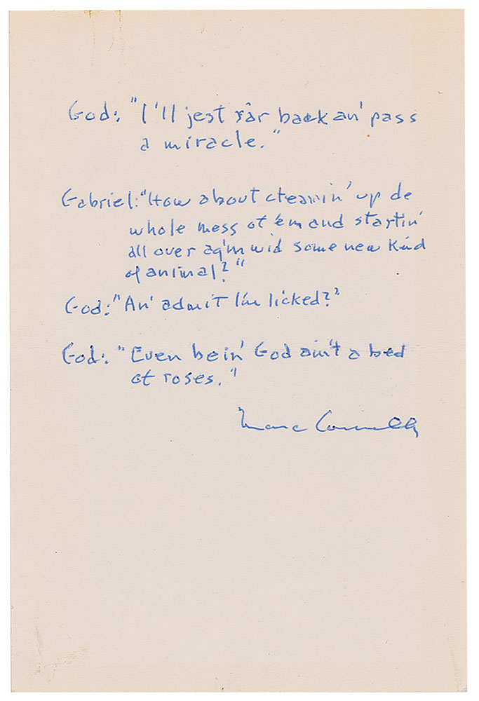 Pulitzer Prize-winning American playwright and director (1890-1980) remembered as one of the wittiest members of the Algonquin Round Table. AQS on an off-white 4 x 6 card, signed at the conclusion, "Marc Connelly." Connelly quotes from his Pulitzer Prize-winning play The Green Pastures, featuring nine lines of dialogue between God and Gabriel, concluding with God's remark: "Even bein' God ain't a bed of roses." In fine condition, with a central horizontal fold.